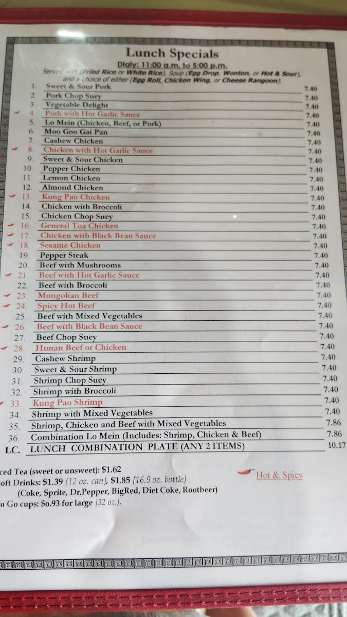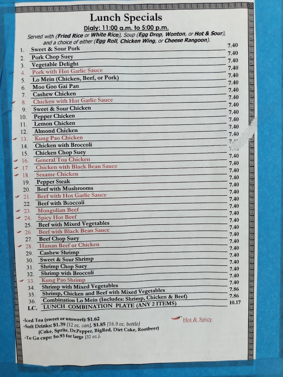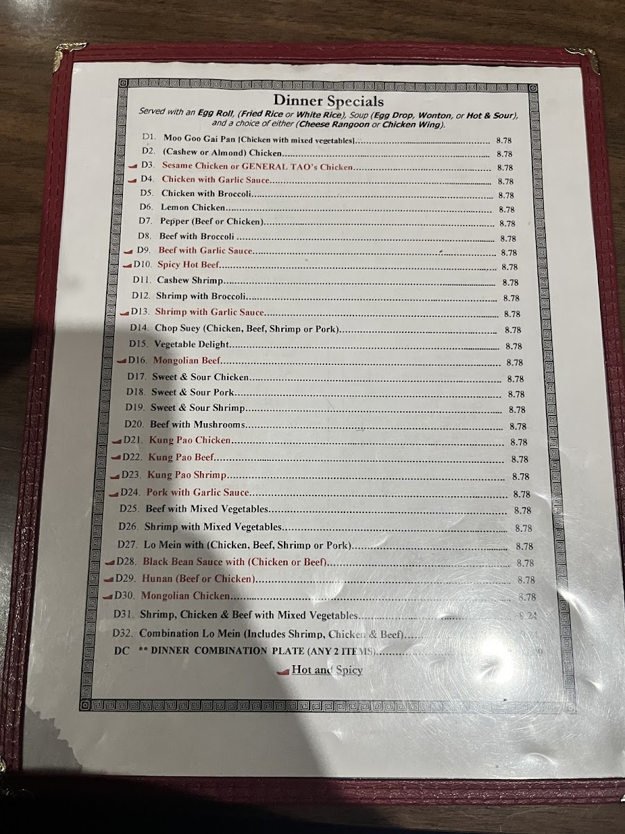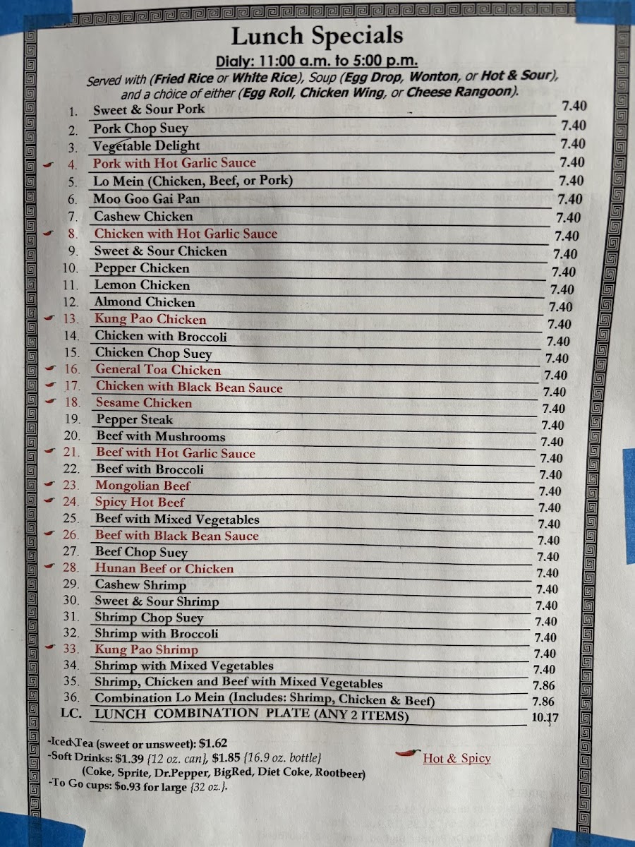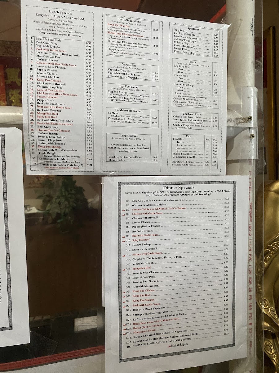 The menu is structured to accommodate quick takeout orders as well as casual dine-in meals. The selection is suitable for lunch and dinner, providing both single-item dishes and combination plates that allow for varied meal sizes. Soups and appetizers also serve well for lighter meals or snacks.